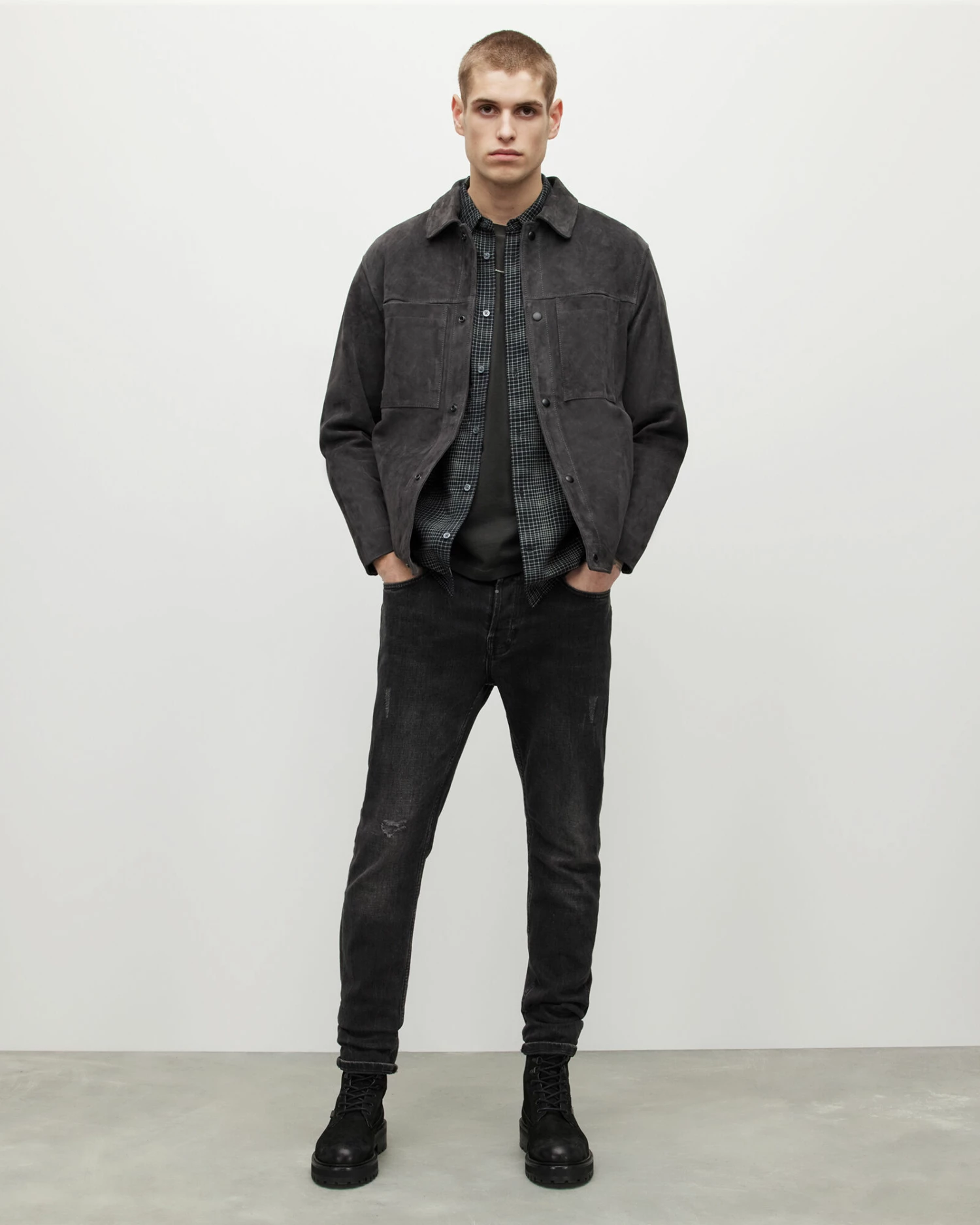 This is the Emley – a classic boxy fit shirt crafted from chrome free suede. It features multiple pockets and centre press stud closure.