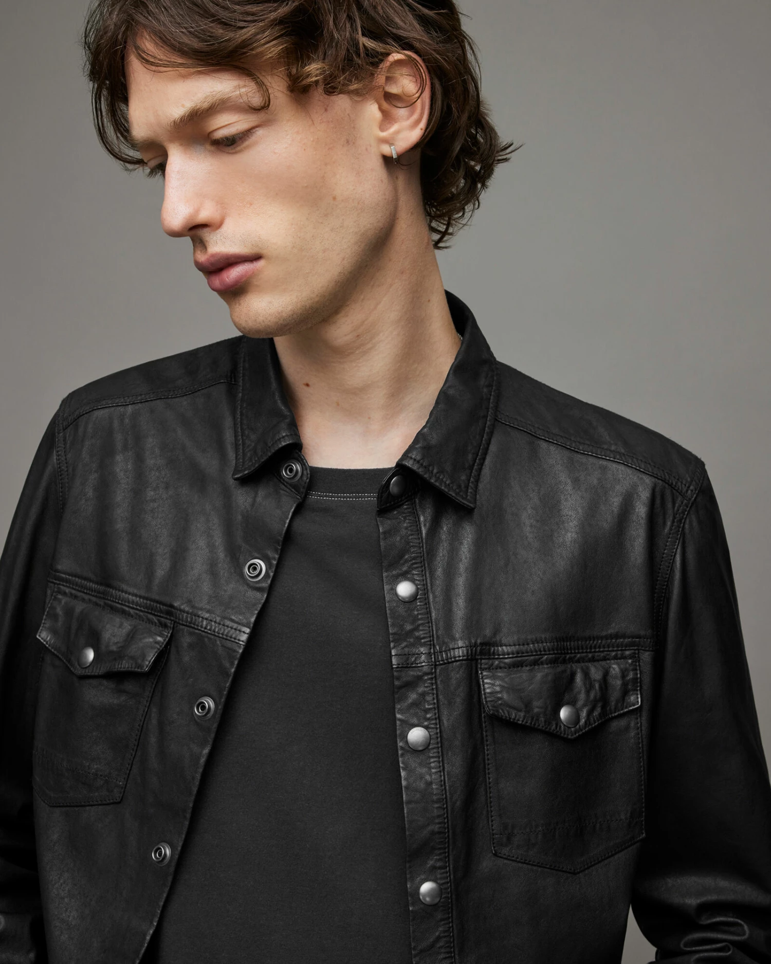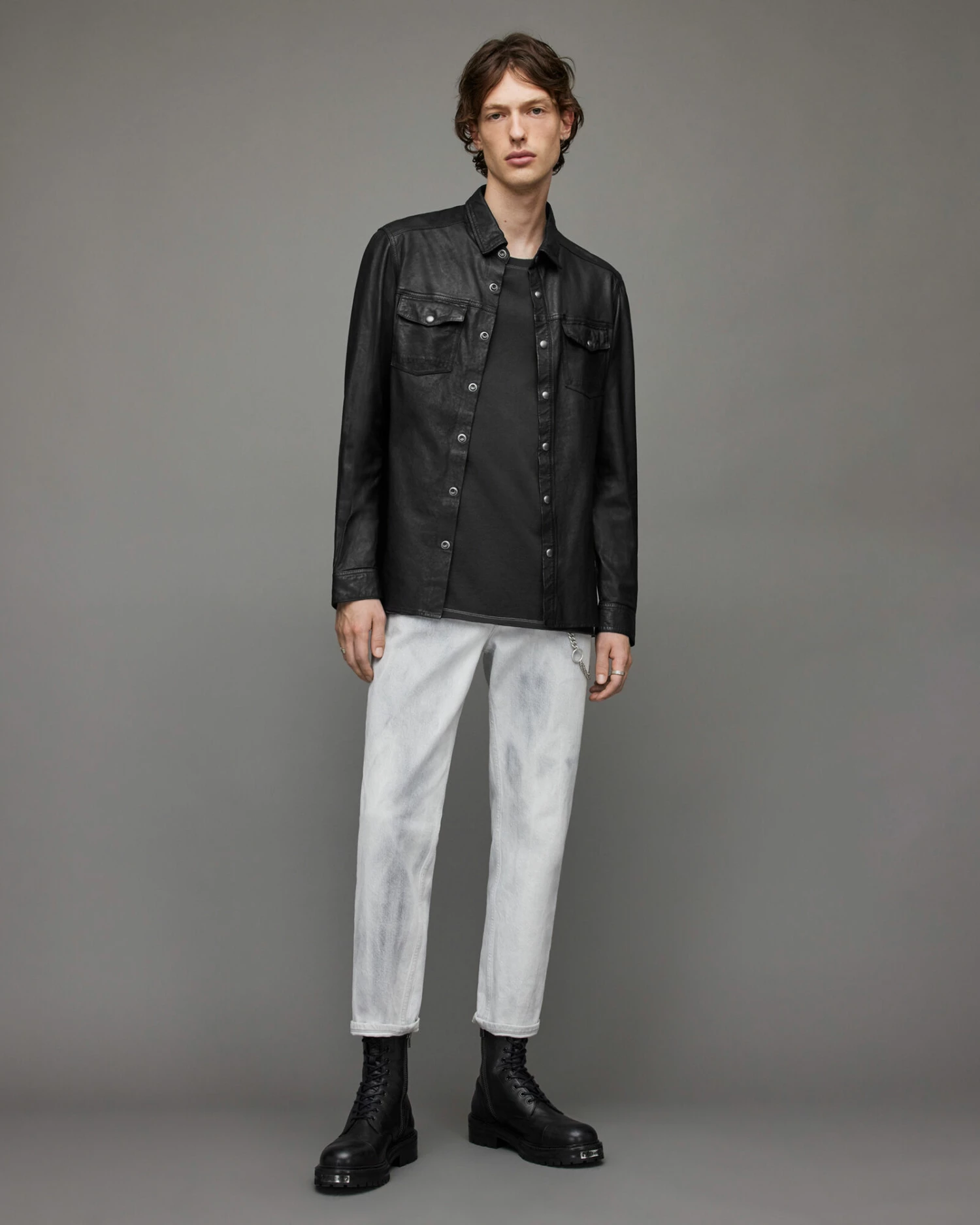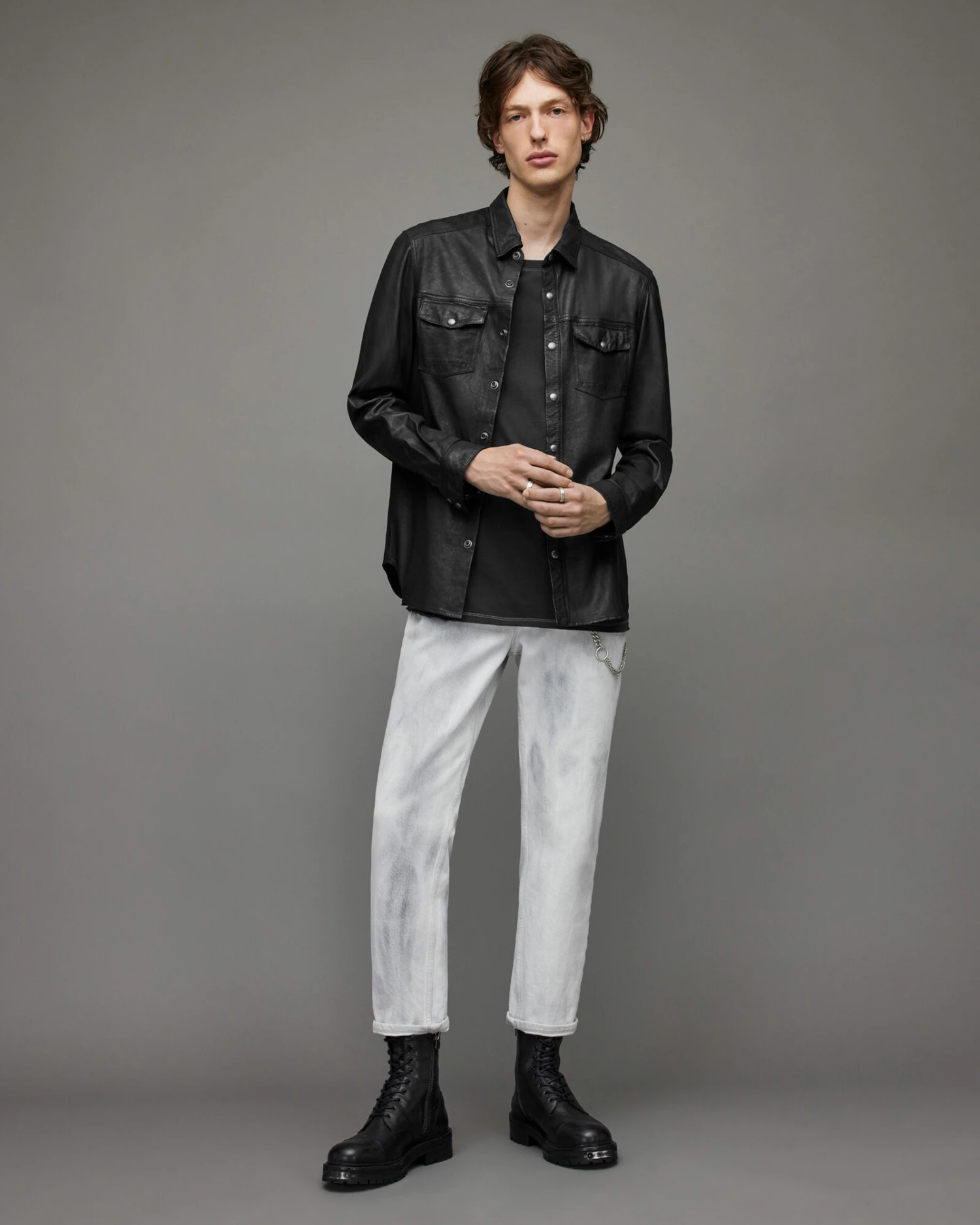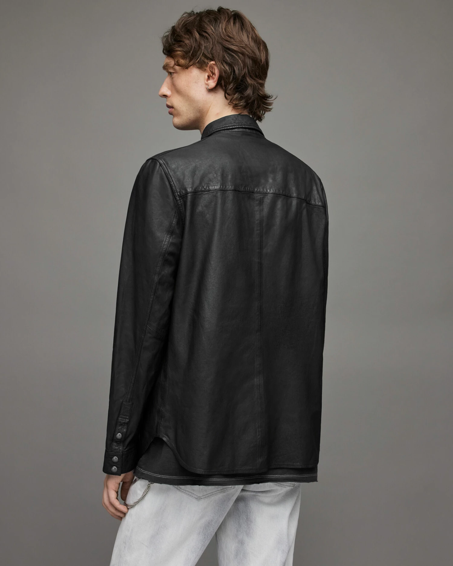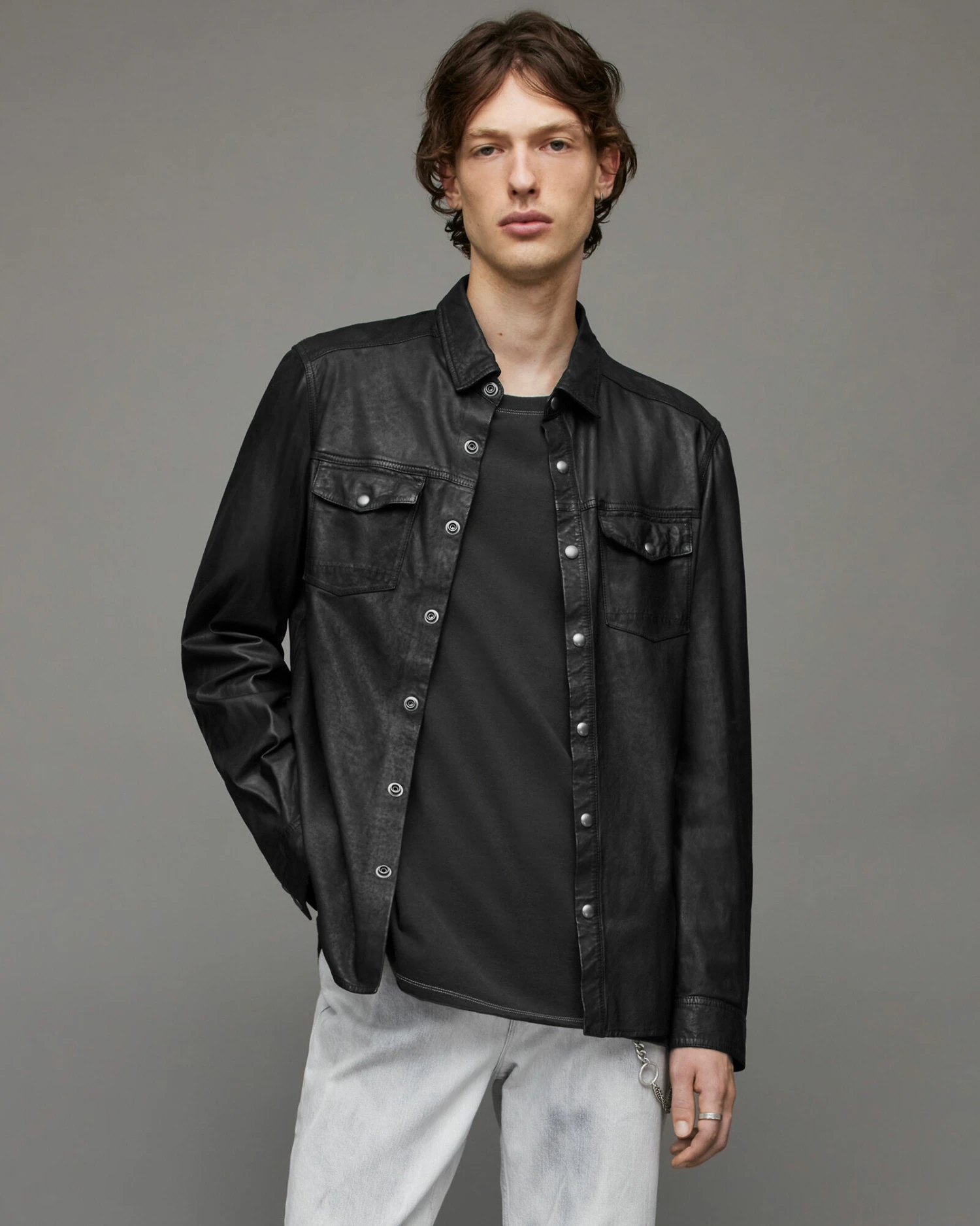 A leather shirt. We’re not messing about. This is the Irwin. Slim fitting with two chest pockets and metal poppers. It’s clean and simple.