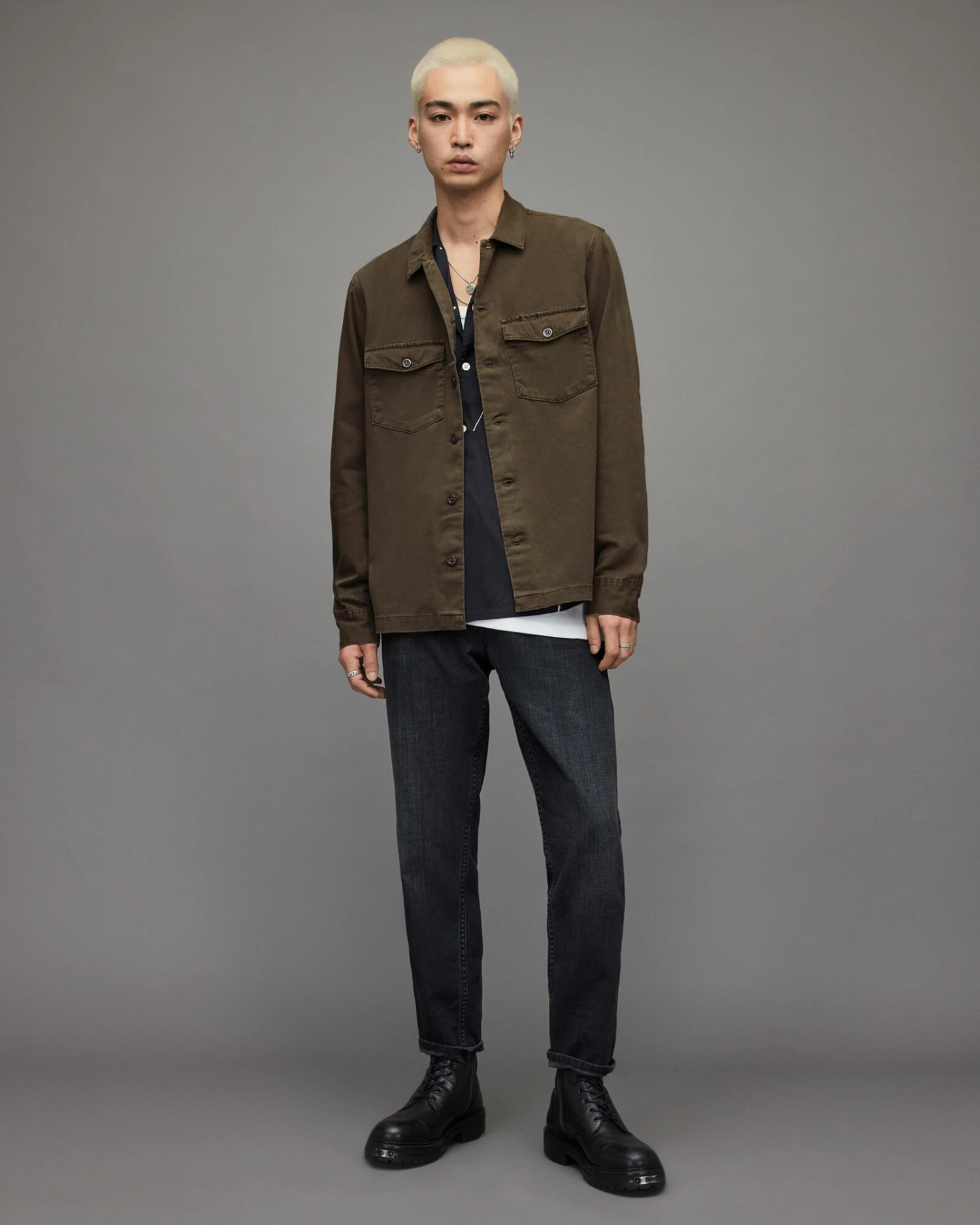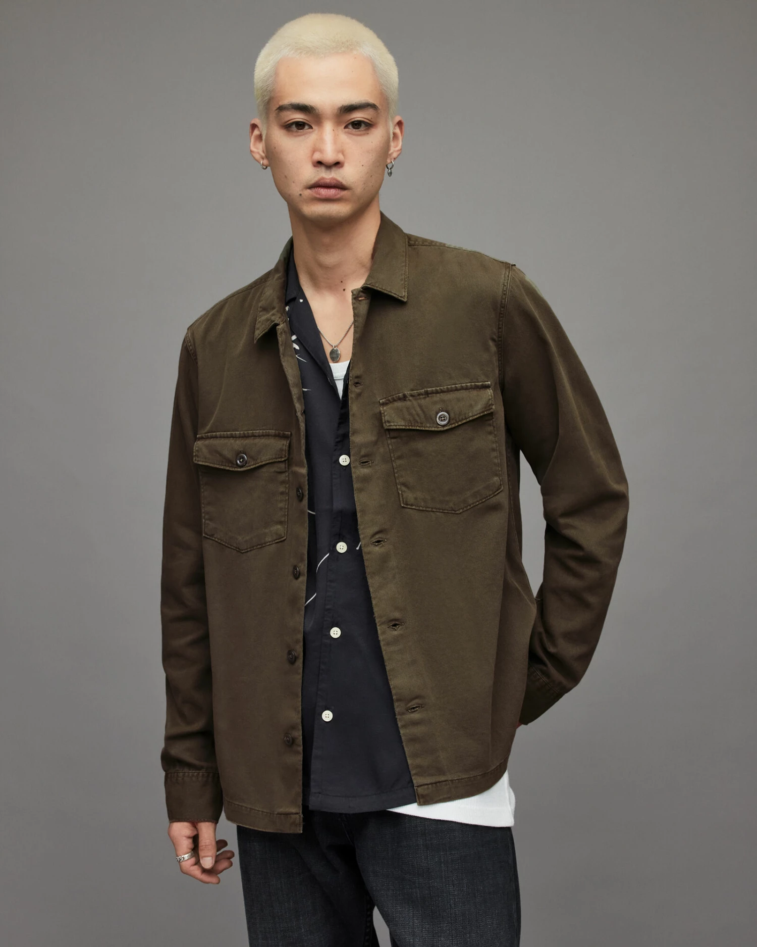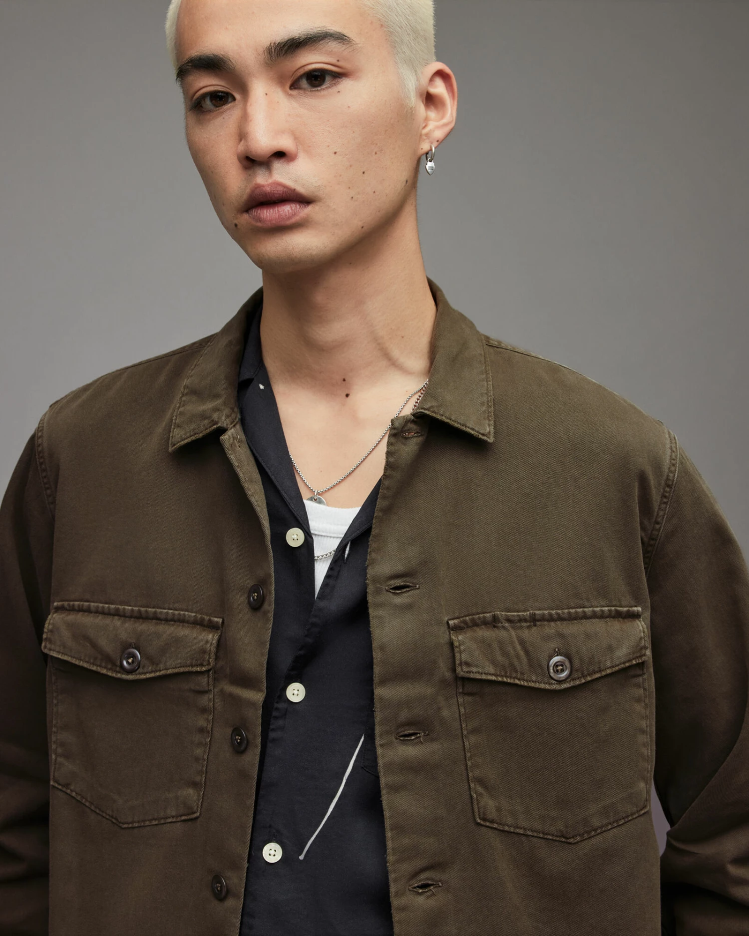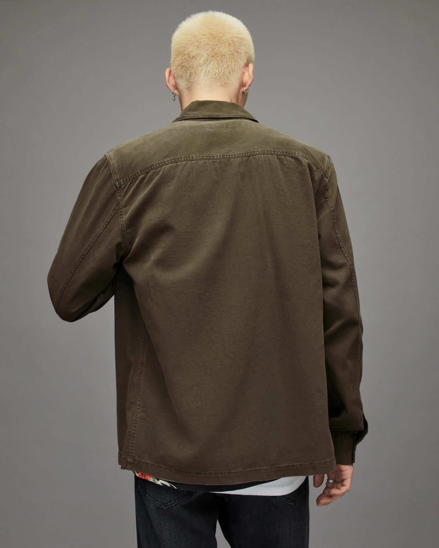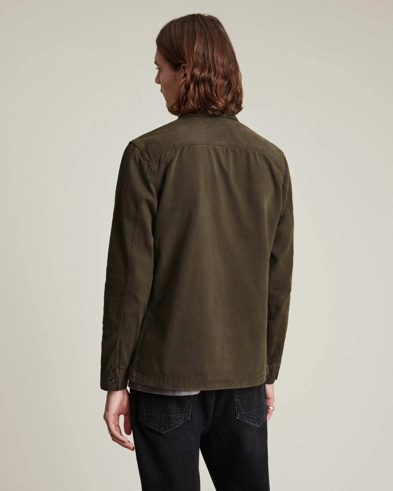 Old-school military. The Spotter, inspired by army overshirts. Heavily-laundered cotton, with large button and patches of distressing. You can just chuck it on.