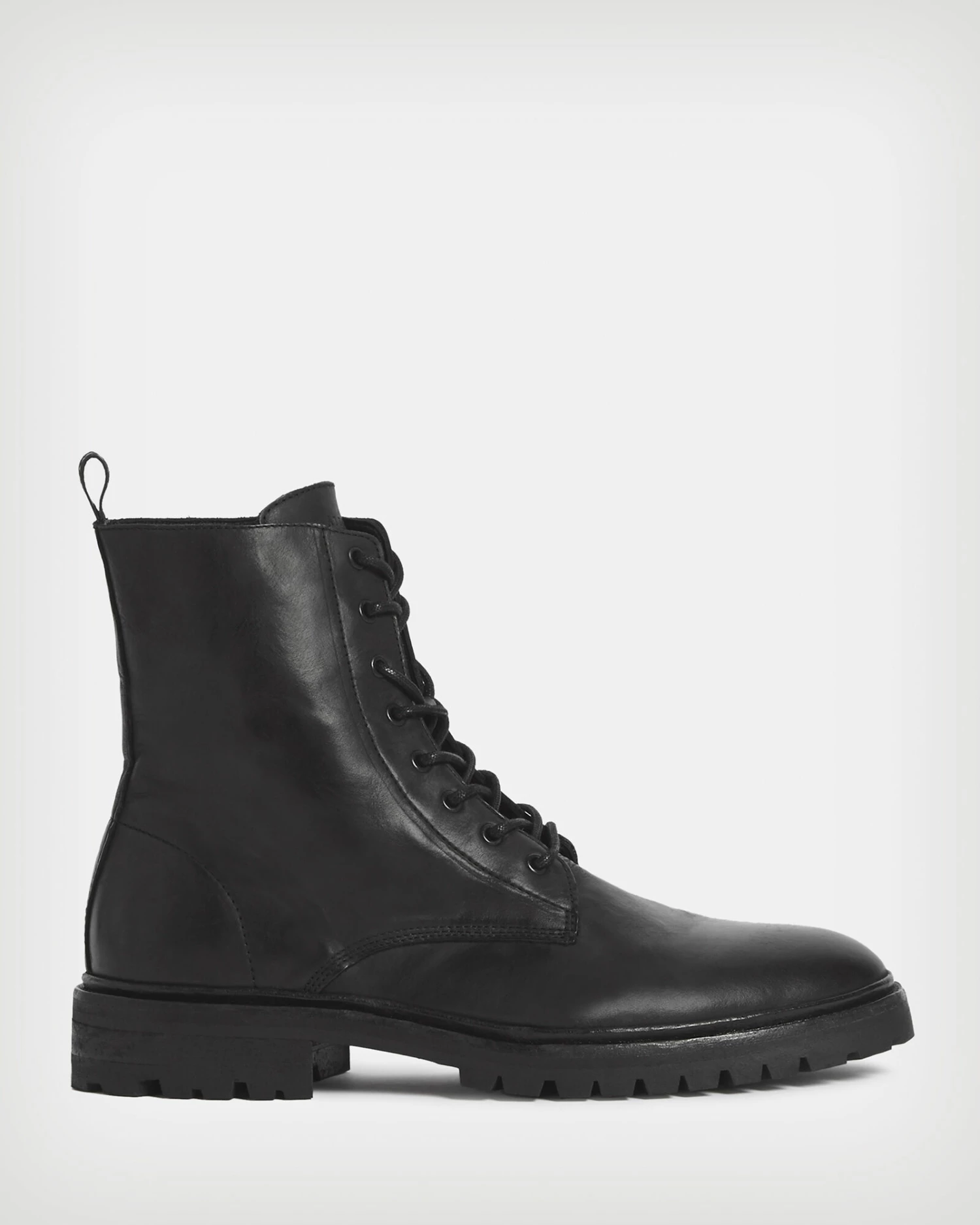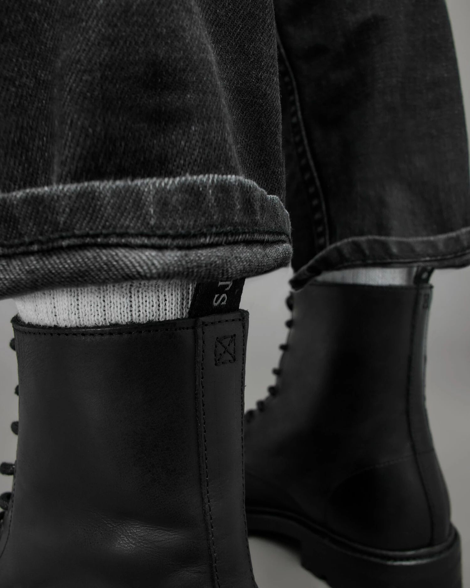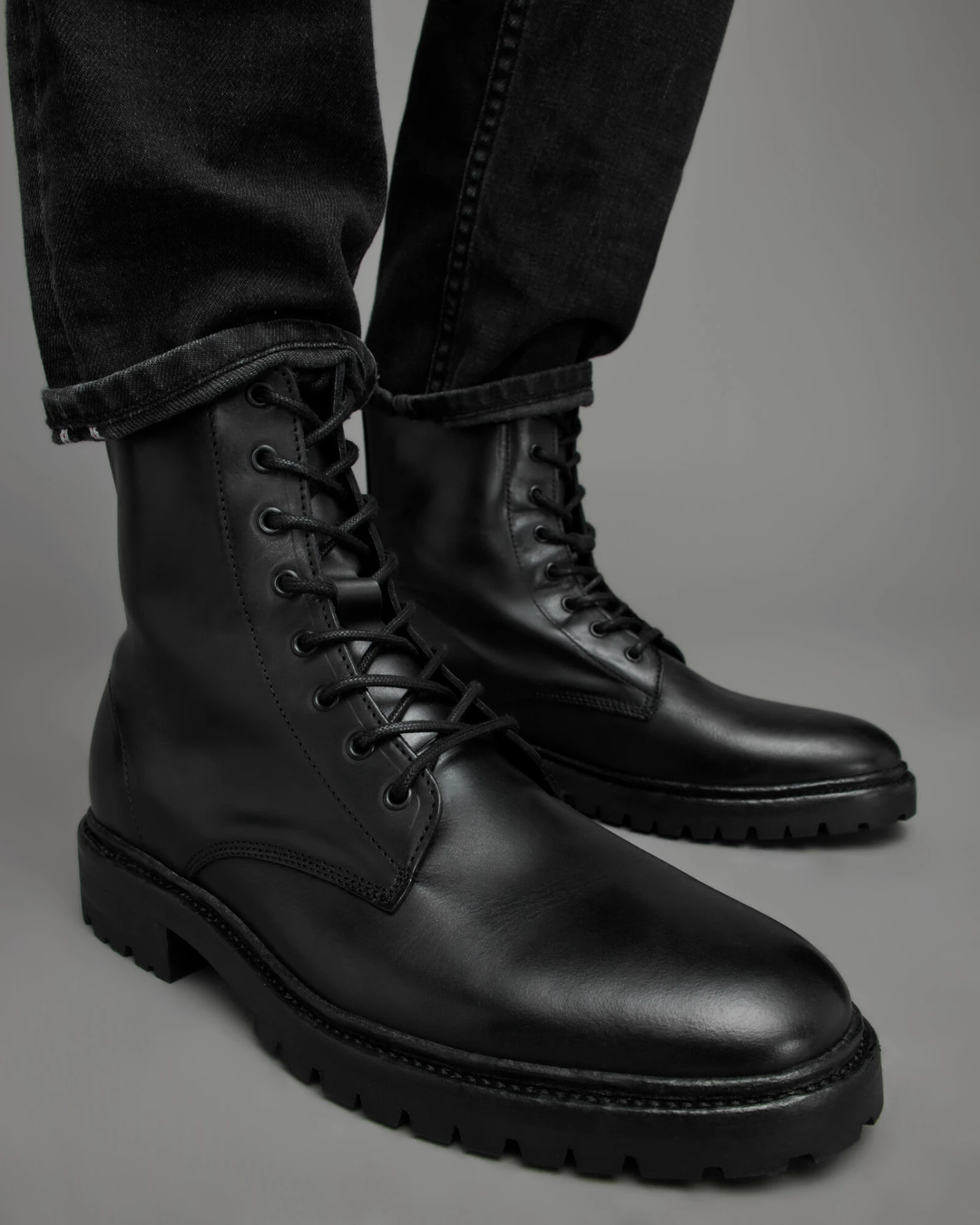 Any weather, anywhere. The Tobias Boots are a seasonal staple. Crafted from smooth leather in a classic military boot shape with a lace up front and sleek sole.